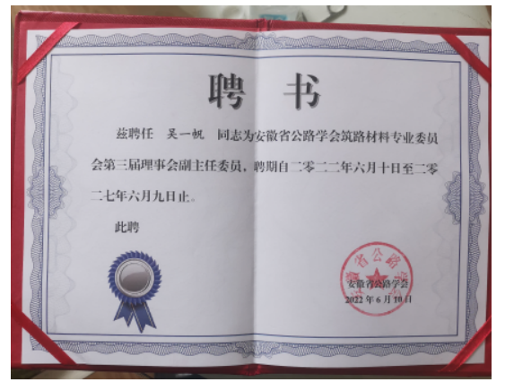 公司董事长吴一帆被聘为安徽省公路学会筑路材料专业委员会第三届理事会副主任委员。